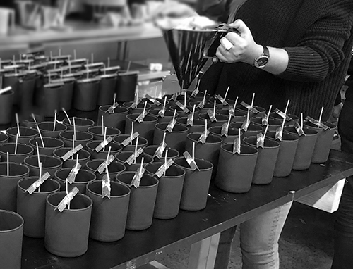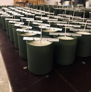 Vervolgens pakken we de glazen erbij waar de kaarsen uiteindelijk in gaan belanden. We zorgen er eerst voor dat de lonten hier op de juiste manier in komen. Daarbij is het enorm belangrijk dat dit perfect op de juiste plaats gebeurt. We hechten er veel waarde aan dat onze natuurlijke kaarsen er professioneel uitzien. Dat het allemaal klopt. Dit is echter niet alleen esthetisch van belang maar de correcte positie van de lont zorgt ook voor het mooi afbranden van de kaars. Zodat we een kaars krijgen die gelijkmatig en zo lang mogelijk brand.Â