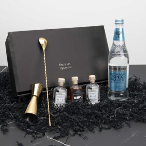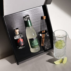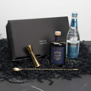 botanische kruidenmix versterkt naar smaak. De gin-tonic box komt ofwel met één grote fles of twee miniflesjes gin. Zo helpt dat laatste relatiegeschenk drank -nieuwelingen uit de nood om de juiste balans in te schatten.